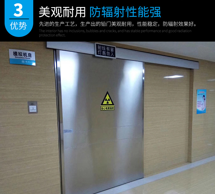 防辐射铅门的分类及选用:门型代号:防辐射铅门有三种开启方式:平开门、手动推拉门、电动推拉门。门型类别分为七种:1)木质骨架平开门RMPa1~3(铅板厚1~3mm)。防辐射铅门2)木质骨架推拉门RMTa1~8(铅板厚1~8mm)3);轻钢板骨架平开门RMPb1~3(铅板厚1~3mm)4);轻钢质骨架手动推拉门RMTb1~3(铅板厚1~3mm)5);钢质骨架平开门RMPc1~8(铅板厚1~8mm)6);钢质骨架手动推拉门RMTc2~8(铅板厚2~8mm)7);钢质骨架电动推拉门RMDc4~16(铅板厚4~16mm);门扇骨架电动推拉门分为:木质骨架(a)、轻钢骨架(b)、钢质骨架(c)。